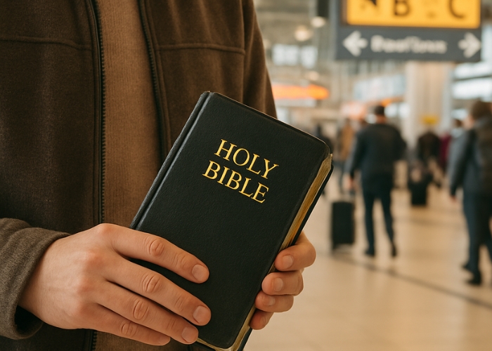 Um pessoa com uma Bíblia em um aeroporto (Imagem: Folha Gospel/Canva IA